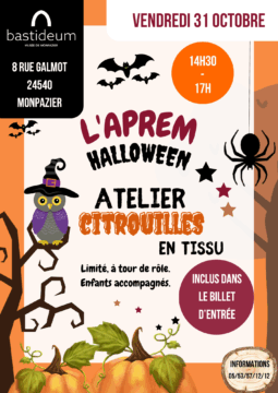 Rendez-vous le 31 octobre entre 14h30 et 17h au Bastideum pour un atelier spécial Halloween : fabrication d’une citrouille en tissu.